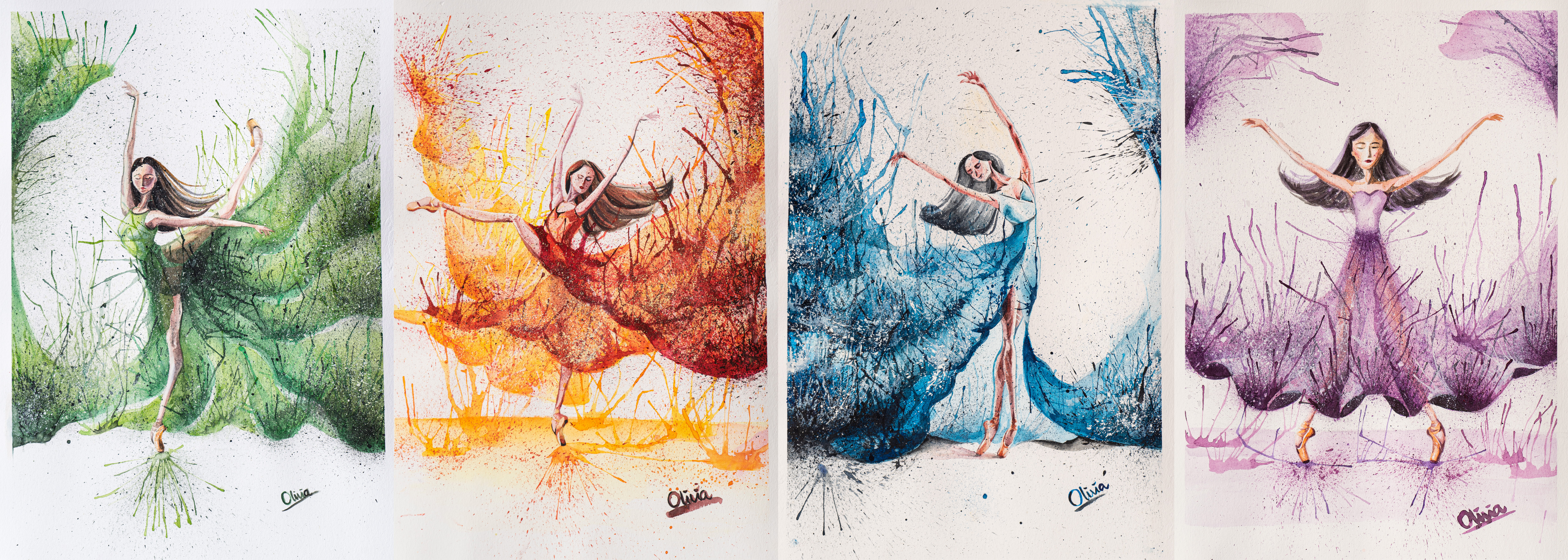 After my ballet studio’s year end show, I was inspired to create this watercolor series, to highlight dancers’ aesthetic postures and my love for ballet.I am always amazed and hope to achieve these postures. My colouring technique, inspired by Ashvin Harrison, is intended to create an exuberant feeling and convey a passion for dancing.