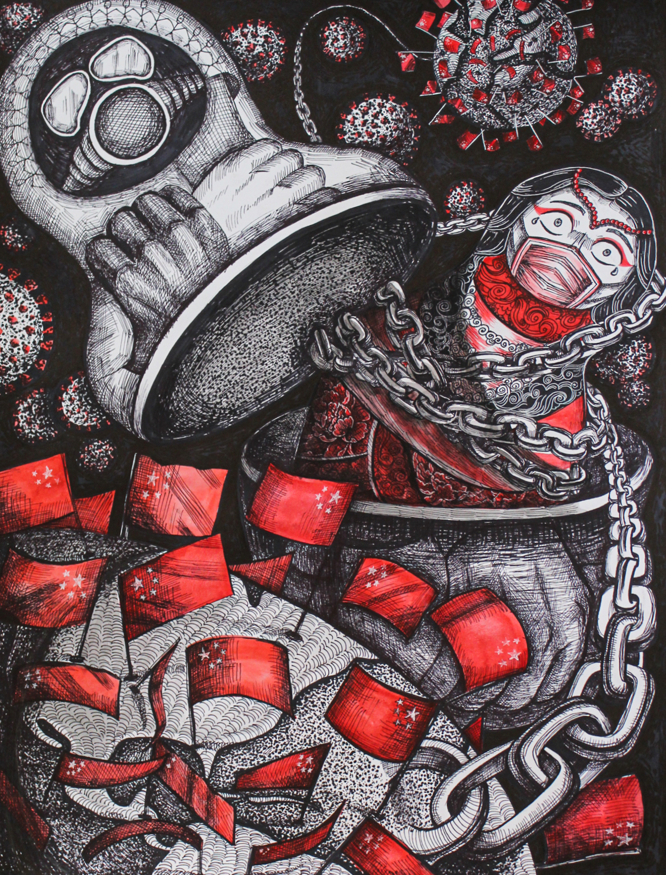 This piece is a part of my Comparative Study. Its theme is about the anti-Chinese hate triggered by COVID-19. The Matryoshka doll symbolizes the “world family”, and the Chinese doll (represented by her Chinese clothing) being pulled away symbolizes alienation. The iron ball is in the shape of coronavirus and the flag of China being placed all over the world, to show how the anti-Chinese hate is amplified by COVID and people’s worry over China’s increasing global influence. The only color red represents China, virus, attack and madness.